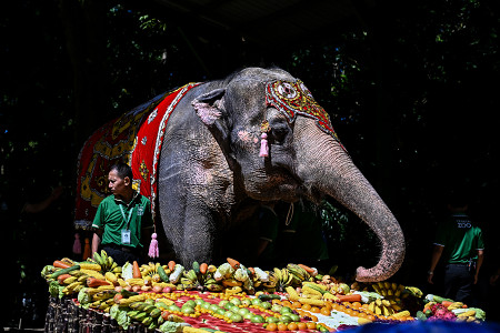 26日、ミャンマー最大都市ヤンゴンの動物園で、72歳の誕生日を祝うメスのゾウ「モモ」。赤や金色の刺しゅうで「おめかし」したモモに、色とりどりの果物が振る舞われた。 【AFP時事】