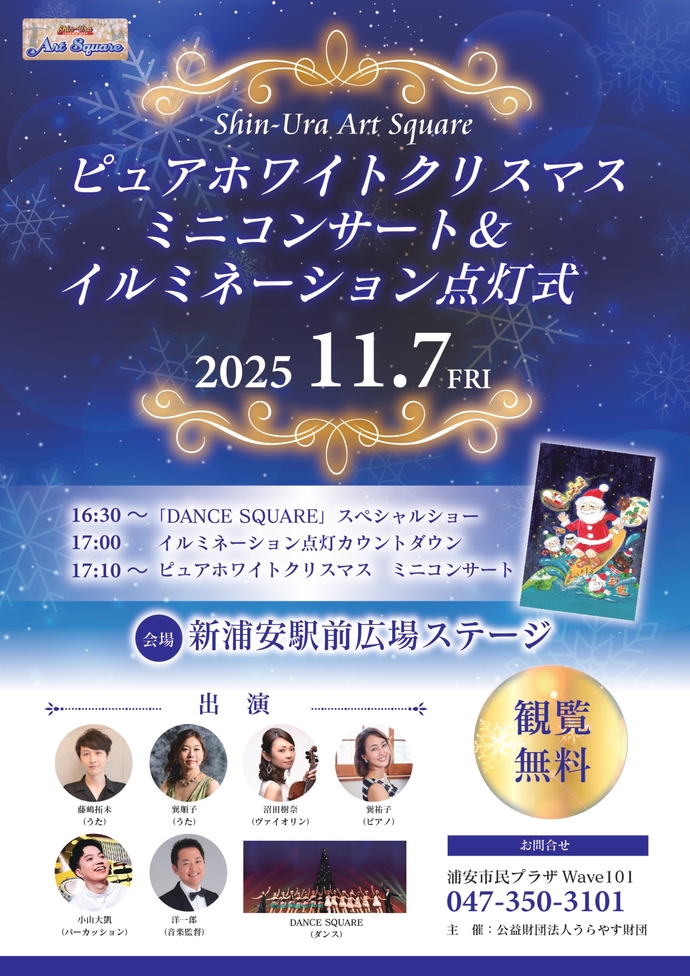 新浦安駅前広場ステージで11月7日、「ピュアホワイトクリスマスミニコンサート&イルミネーション点灯式」が開催される。主催は公益財団法人「うらやす財団」。