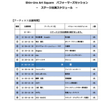 当日は13組のパフォーマーが出演する、以下は出演順。「和太鼓 楔 kusabi」(和太鼓)、宮田想生さん(ボイパ・ウクレレ弾き語り)、ろうパフォーマー「ムッシュー・マサ」さん(大道芸)、Shigenoさん(ギター弾き語り)、ciiaさん(シンガー・ソングライター)、カワーイナヤ(テルミン)、ショッコラン(ファミリーコンサート)、かみしばいさん(紙芝居)、駒澤良浩さん(音楽演奏)、のび~さん(ウクレレ弾き語り)、小原繁久さん(アコースティックギター弾き語り)、かずん(和風フォークバンド)、JOE・MAGIC(マジック・ジャグリング・大道芸)。