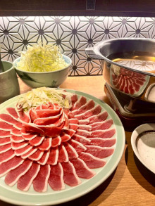 鴨しゃぶコース(3,500円)は、前菜(数の子チーズ、アグー豚しょうが、静岡焼津かまぼこ、わさび菜おひたし)、刺し身(マグロ赤身、タイ、ミズダコ)、新潟栃尾揚げネギ肉みそ焼き、幸々そばだしかもしゃぶ、えびと野菜の天ぷら、〆幸々オリジナルあおさそばで構成する。