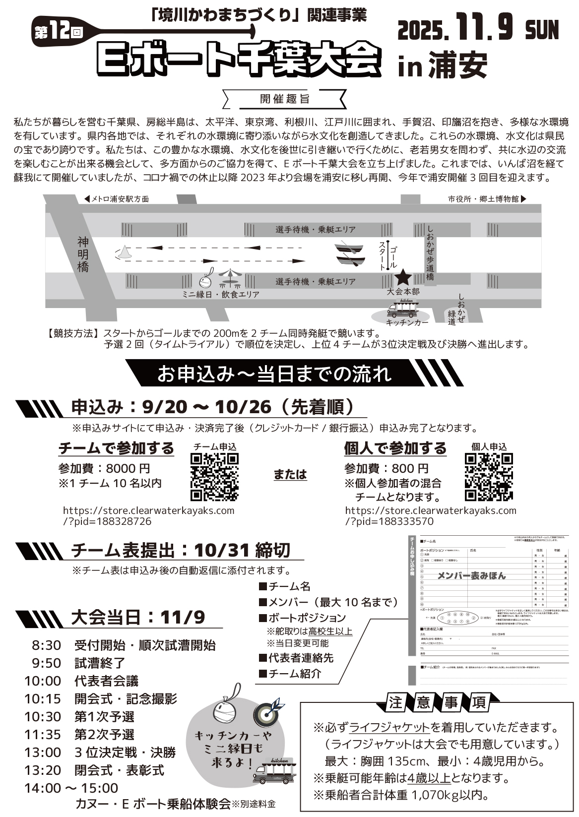 「第12回Eボート千葉大会 in 浦安」が11月9日、境川のしおかぜ歩道周辺(浦安市美浜1)でに開催される。