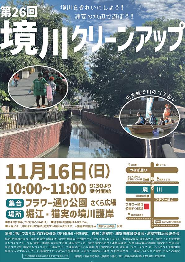 浦安のフラワー通りさくら公園(浦安市堀江3)付近で11月16日、「第26回境川クリーンアップ」が開催される。