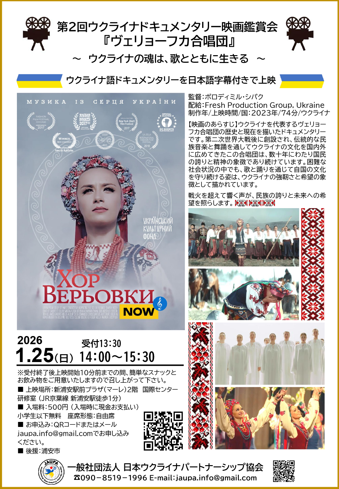 ウクライナのドキュメンタリー映画「ヴェリョーフカ合唱団」が1月25日、「新浦安駅前プラザ(マーレ)」(浦安市入船1)2 階・国際センターで上映される。