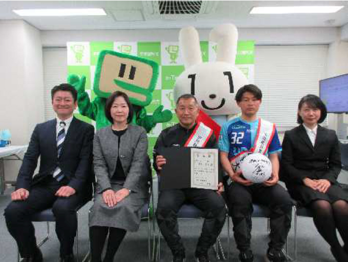 左から税務署の田口副署長、木村署長、都並敏史監督、豊島朱凌選手、緒方副署長