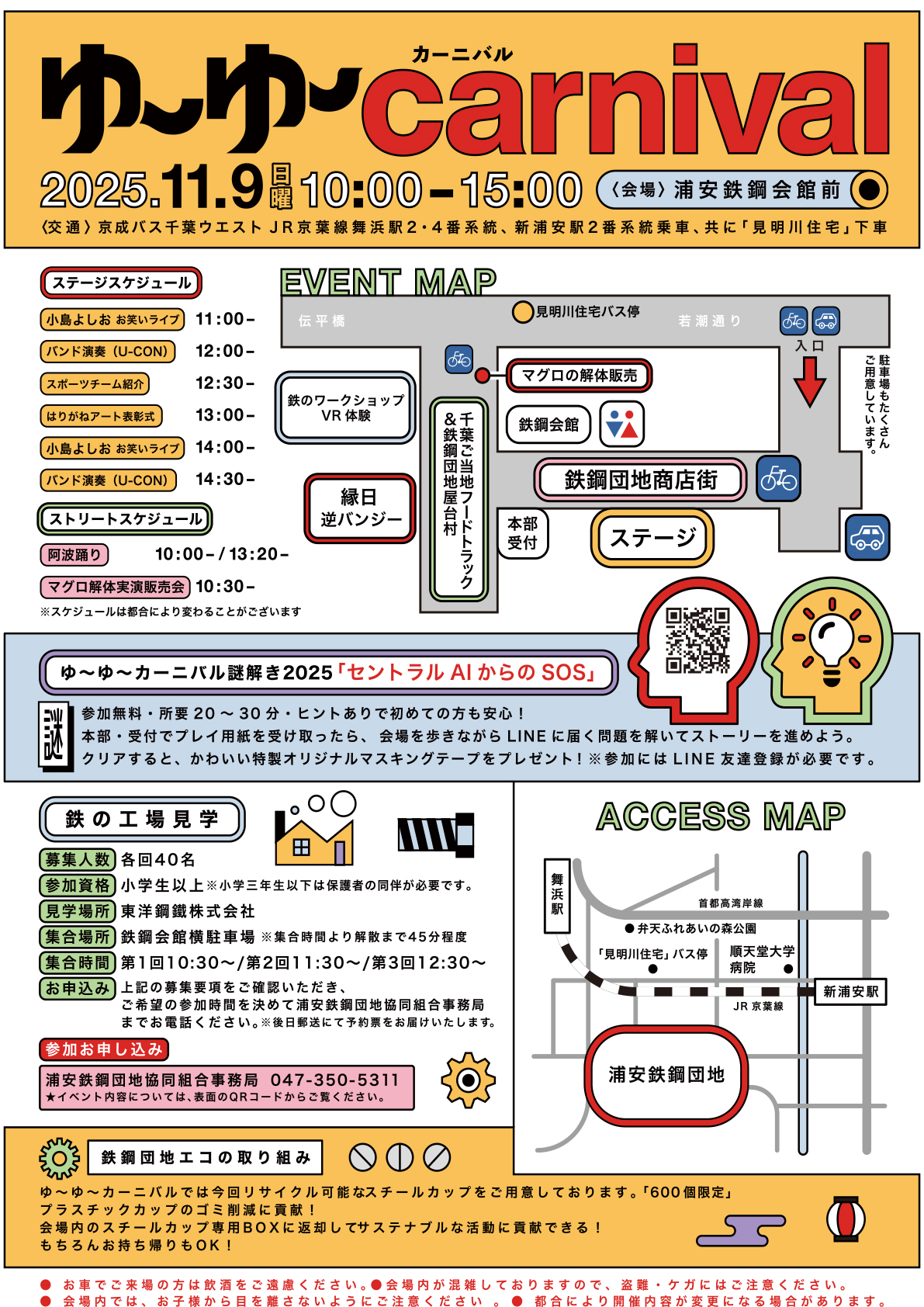 浦安鉄鋼会館(浦安市鉄鋼通り2)周辺で11月9日、一般も参加できるイベント「ゆ~ゆ~カーニバル2025」が開催される。